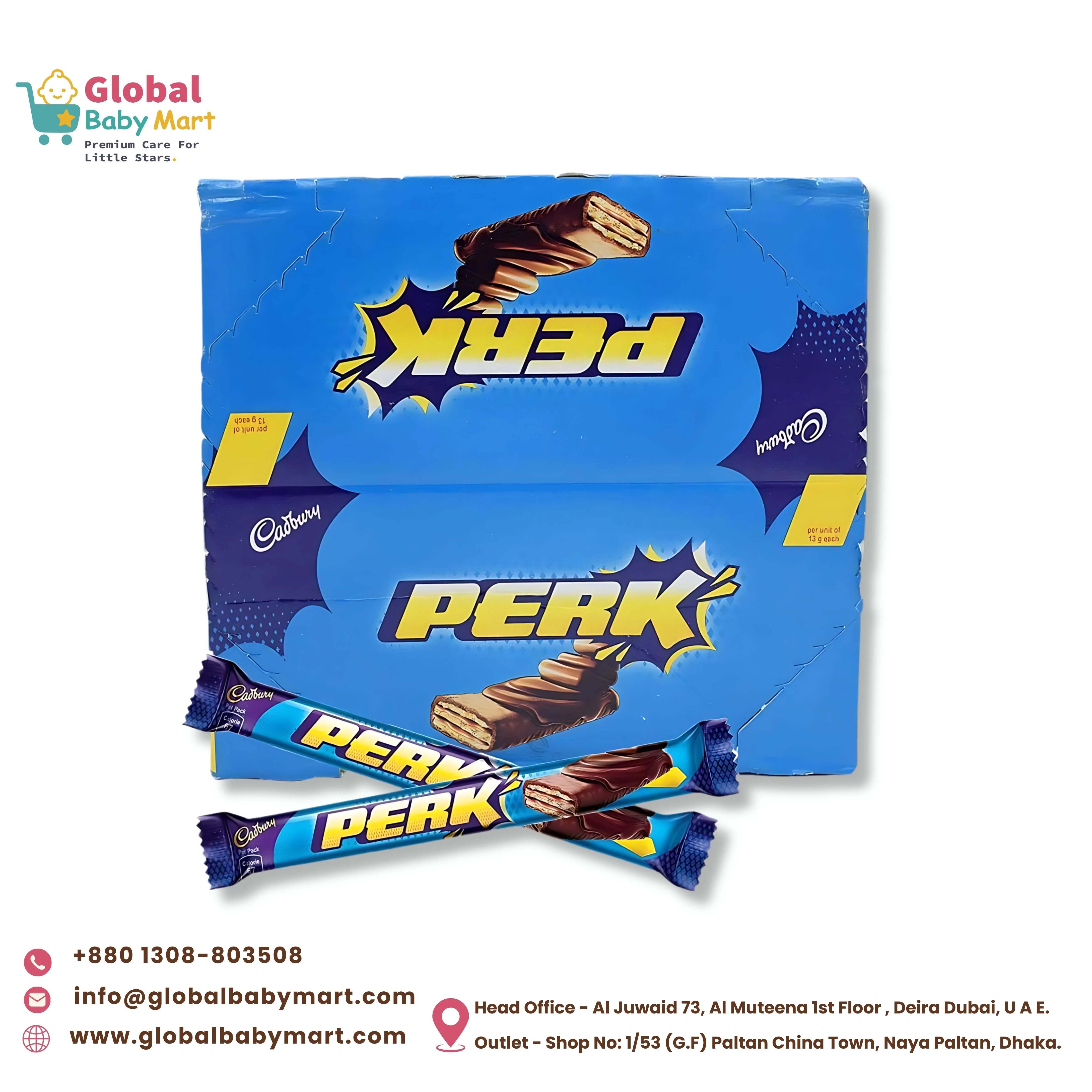 Each Perk bar features crunchy layered wafers coated in smooth Cadbury milk chocolate, offering a light yet satisfying chocolate experience. Slim, crispy, and easy to carry, Perk is perfect for school tiffin, office breaks, party treats, and retail resale.