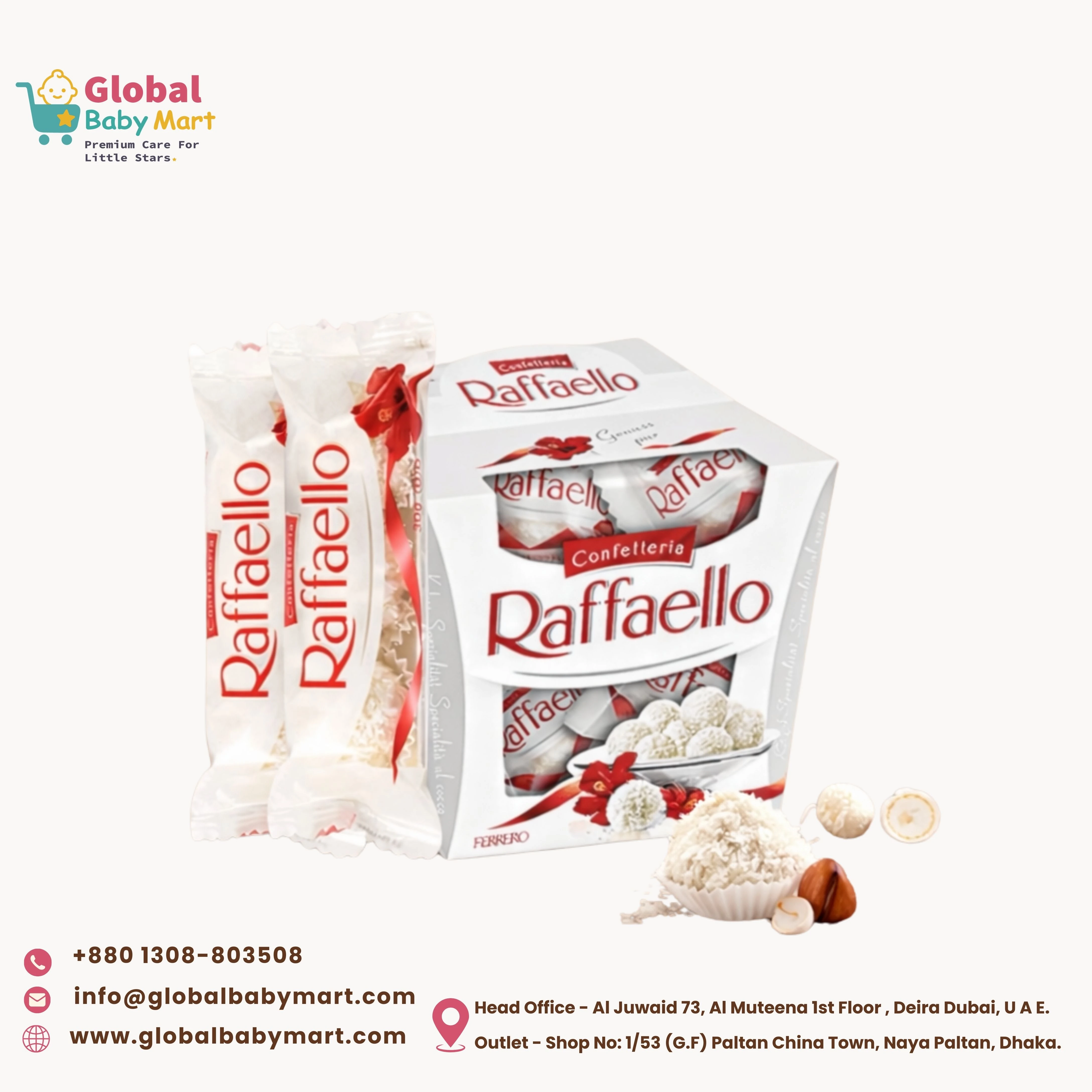 Ferrero Raffaello Coconut Almond Chocolate is a premium confectionery treat known for its delicate taste and elegant presentation. Each piece features a crunchy almond at the center, surrounded by smooth creamy filling and a crispy wafer shell, all coated with fragrant coconut flakes.