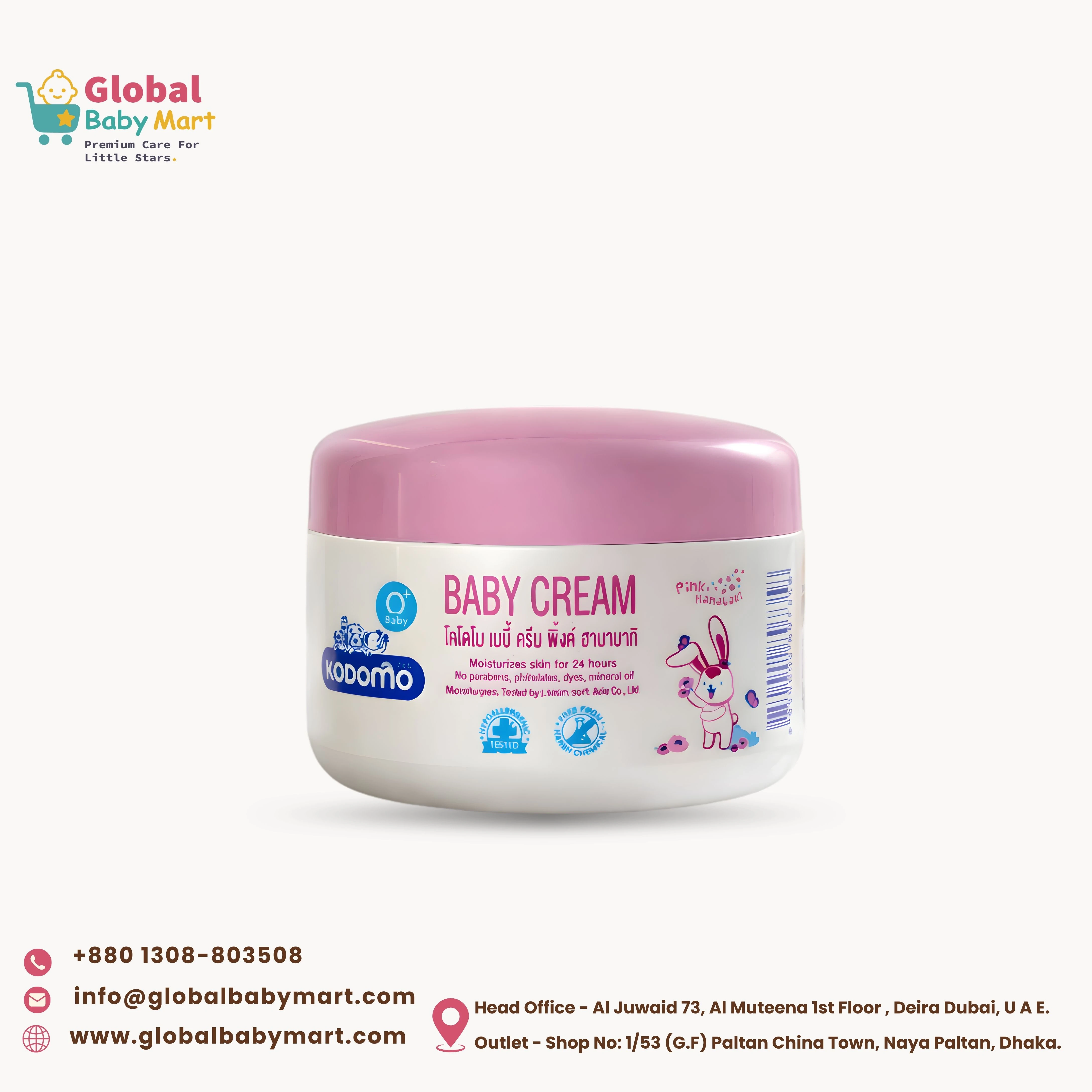 Kodomo Baby Cream Pink Hanabaki is a gentle moisturizing cream specially developed for delicate baby skin. The lightweight formula keeps your baby’s skin soft, smooth, and hydrated for up to 24 hours. It is dermatologically tested and free from harmful chemicals such as parabens, mineral oil, and artificial dyes, making it safe for everyday use.