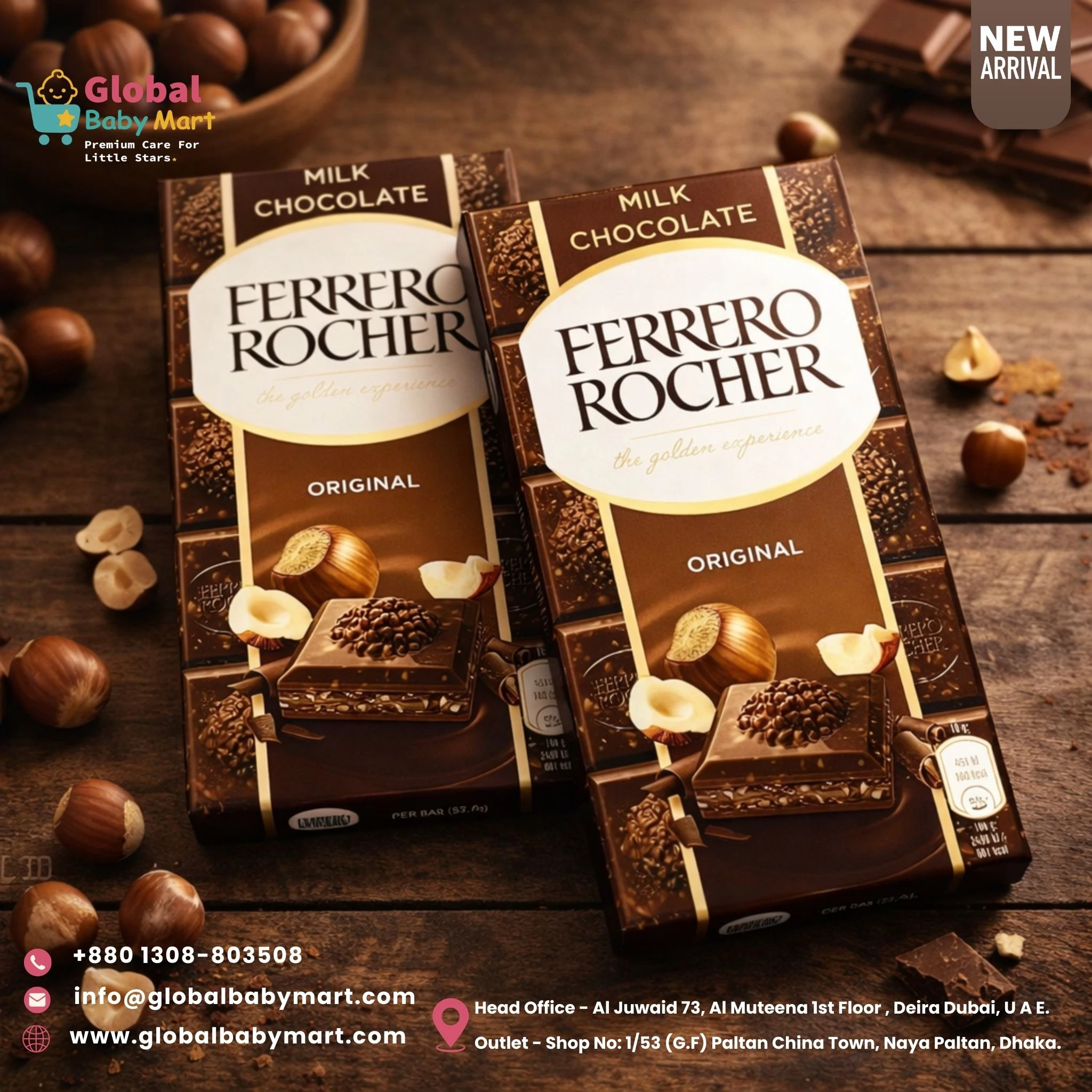 Inspired by the famous Ferrero Rocher pralines, the chocolate bar combines velvety milk chocolate with crispy hazelnut pieces to create a unique and indulgent treat. Perfect for gifting, sharing, or enjoying as a premium chocolate snack.