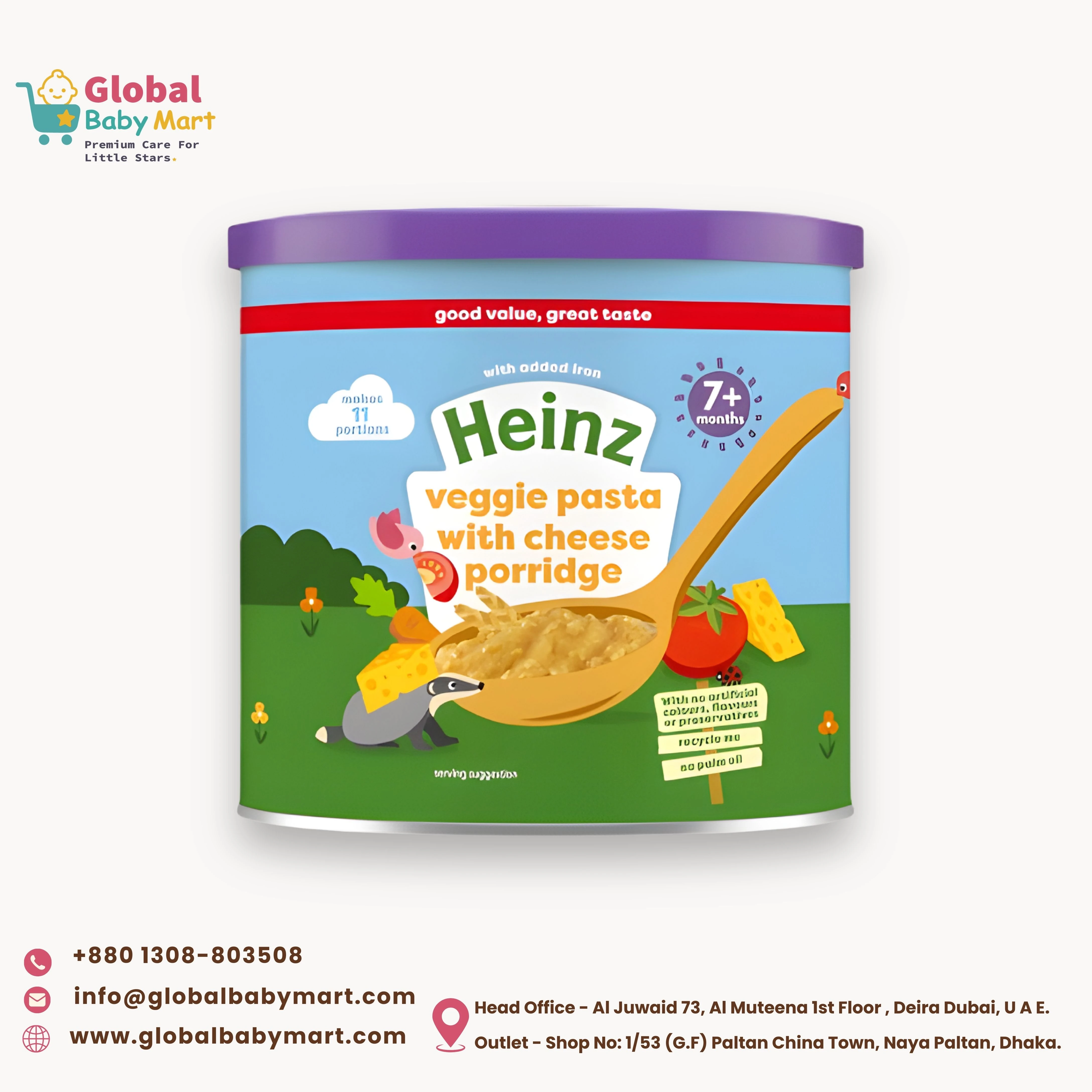 Heinz Veggie Pasta with Cheese Porridge is specially made for babies aged 7 months and above. This tasty and nutritious meal combines pasta, vegetables, and cheese to introduce new flavors and textures during your baby’s weaning journey.