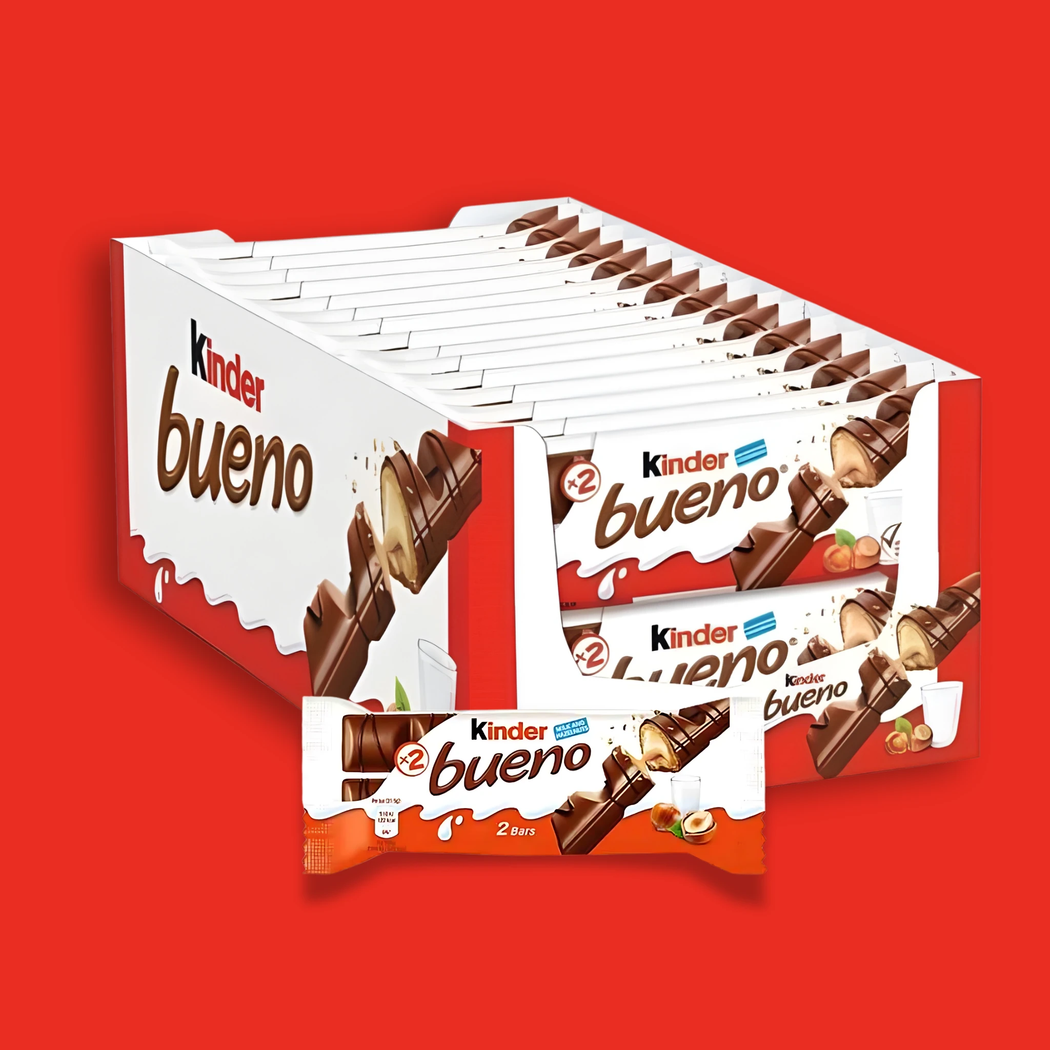 Enjoy the irresistible taste of Kinder Bueno Chocolate Bar. Each pack contains 2 individually wrapped crispy wafer bars filled with smooth hazelnut cream and coated in fine milk chocolate.